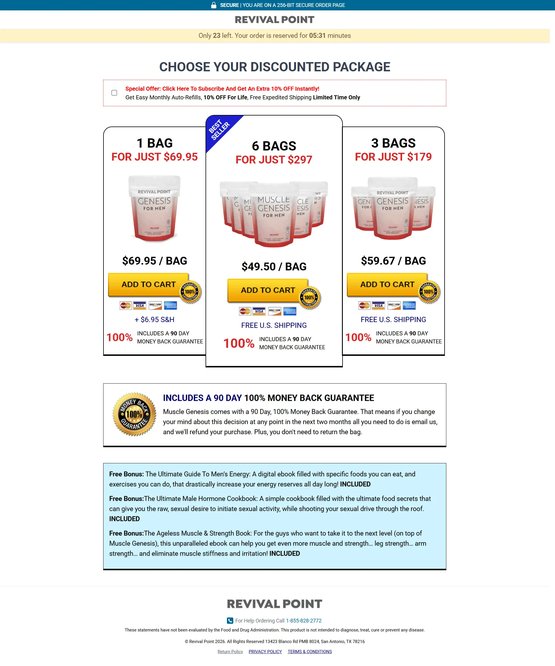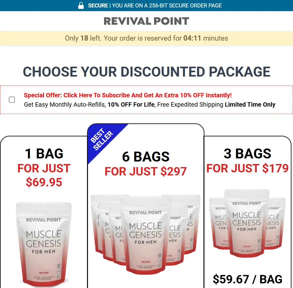 Muscle Genesis is offered in multiple package options for customers looking for simple online ordering, bundle savings, and daily supplement support.