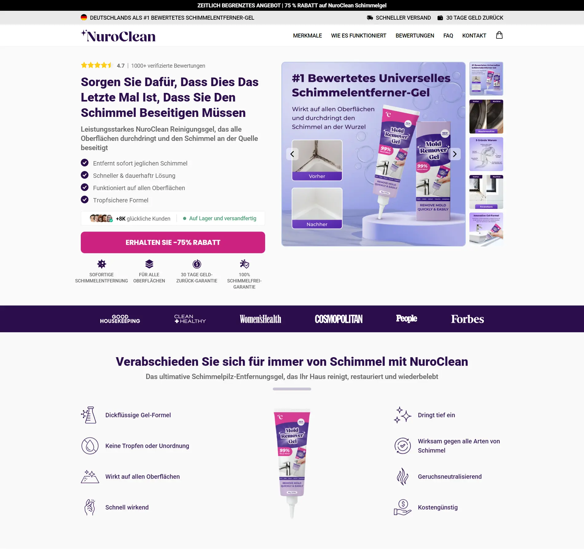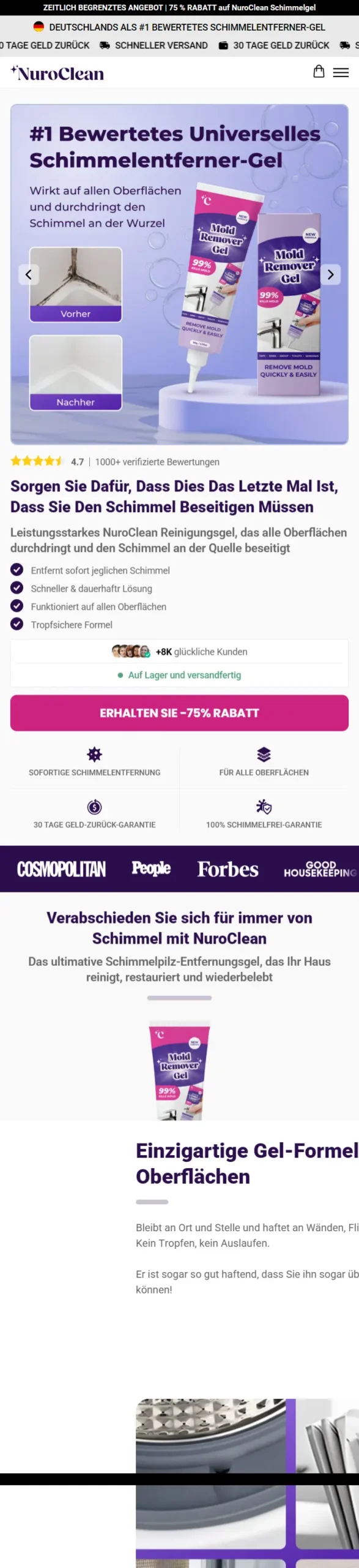 NuroClean wurde entwickelt, um sichtbare Schimmelspuren auf verschiedenen Oberflächen zu lösen. Die dickflüssige Gel-Formel haftet an vertikalen Flächen und erleichtert die gezielte Anwendung.