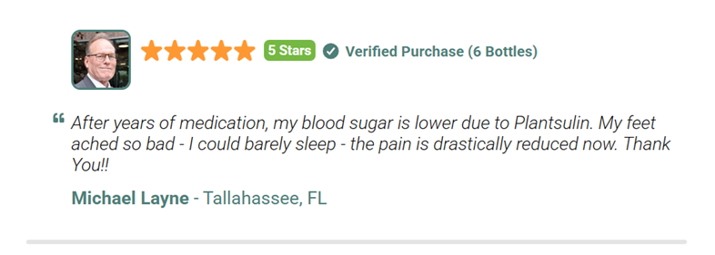 5 Stars Verified Purchase (6 Bottles) After years of medication, my blood sugar is lower due to Plantsulin. My feet ached so bad – I could barely sleep – the pain is drastically reduced now. Thank You!! Michael Layne – Tallahassee, FL 5 Stars Verified Purchase (6 Bottles) I just purchased another six bottles. It works great and I have been telling everyone I know who has this problem how well it works. Truly a miracle. Brenda Roth – Greenwich, CT Claim Your Discounted Plantsulin® Below While Supplies Last BASIC 1 BOTTLE 30 Day Supply 69 / Bottle+ $9.99 Shipping Add To Cart $149.00 $78.99 MOST POPULAR 6 BOTTLES 180 Day Supply SAVE $600 49 / Bottle FREE Bonus Bottle! 2 FREE Bonus Books! FREE Fast Shipping! Add To Cart $894.00 $294 BUNDLE