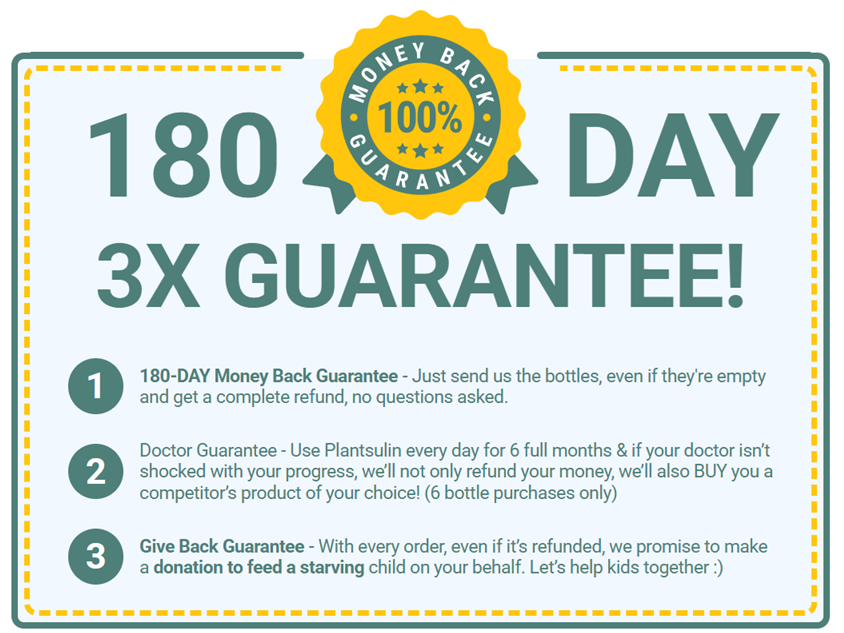 3 BOTTLES 90 Day Supply SAVE $270 59 / Bottle FREE Bonus Book! FREE Fast Shipping! Add To Cart $447.00 $177 Our Customers Say 4.91/5 Based on 79,200+ reviews! 180 DAY 3X GUARANTEE! 180-DAY Money Back Guarantee – Just send us the bottles, even if they’re empty and get a complete refund, no questions asked. Doctor Guarantee – Use Plantsulin every day for 6 full months & if your doctor isn’t shocked with your progress, we’ll not only refund your money, we’ll also BUY you a competitor’s product of your choice! (6 bottle purchases only) Give Back Guarantee – With every order, even if it’s refunded, we promise to make a donation to feed a starving child on your behalf. Let’s help kids together 🙂 Frequently Asked Questions How Do I Take Plantsulin? Can I Take Plantsulin With My Current Presciption? Are There Any Side Effects? How Long Will It Take For My Order To Reach Me? What Are The Terms Of Your Guarantee?