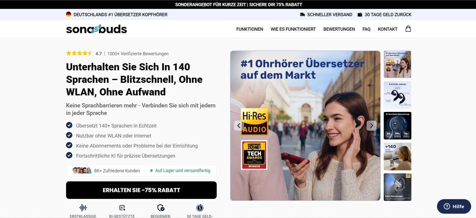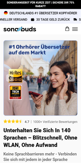 -75% Rabatt Keine Sprachkurse, Reiseführer oder Roaming-Gebühren SonaBuds gibt Ihnen die Freiheit, offline und ohne Abo zu kommunizieren – ganz ohne App, mobile Daten oder kostenpflichtige Hilfe. Technologie, die wie ein Mensch übersetzt Alle Funktionen, die Sie für die globale Kommunikation benötigen, finden Sie hier Mehr als 73% der Reisenden stoßen im Ausland auf Sprachbarrieren, was oft zu frustrierenden Situationen oder verpassten Chancen führt. Mit SonaBuds verschwinden diese Herausforderungen. SonaBuds image Übersetzung in Echtzeit SonaBuds bietet sofortige Übersetzung mit fortschrittlicher KI, die sich an verschiedene Akzente und Slang anpasst. Perfekt für Reisende, um kostspielige Missverständnisse zu vermeiden. SonaBuds image Zwei-Wege-Kommunikation SonaBuds übersetzen Sie sofort beide Seiten eines Gesprächs. Sie können problemlos über 140 Sprachen sprechen und verstehen. Sie können überall problemlos Gespräche führen. SonaBuds image Funktioniert offline Machen Sie sich keine Sorgen, wenn Sie kein Wi-Fi haben. SonaBuds funktioniert offline, so dass Sie es auch in abgelegenen Gebieten, in Flugzeugen oder an Orten mit schlechtem Empfang nutzen können. SonaBuds image Keine versteckten Gebühren ergessen Sie teure Übersetzungs-Apps. Mit SonaBuds erwerben Sie einmalig eine unbegrenzte Anzahl von Übersetzungen ohne zusätzliche Kosten oder Abonnements. Freies Kommunizieren in 3 einfachen Schritten SonaBuds image Mit Ihrem Gerät koppeln Verbinden Sie Ihr SonaBuds über Bluetooth mit Ihrem Smartphone. SonaBuds image SonaBuds image Wählen Sie die Sprache Wählen Sie in der App SonaBuds die Sprache, in die Sie übersetzen möchten. SonaBuds image SonaBuds image Freies Gespräch Stecken Sie sie in Ihre Ohren und sprechen Sie. Die Ohrstöpsel übersetzen Ihr Gespräch in Echtzeit. Einfache Kommunikation an jedem Ort 30-Tage-Geld-zurück-Garantie Einfache Kommunikation an jedem Ort 30-Tage-Geld-zurück-Garantie Einfache Kommunikation an jedem Ort 30-Tage-Geld-zurück-Garantie Einfache Kommunikation an jedem Ort 30-Tage-Geld-zurück-Garantie Einfache Kommunikation an jedem Ort 30-Tage-Geld-zurück-Garantie Einfache Kommunikation an jedem Ort 30-Tage-Geld-zurück-Garantie Einfache Kommunikation an jedem Ort 30-Tage-Geld-zurück-Garantie Einfache Kommunikation an jedem Ort 30-Tage-Geld-zurück-Garantie 100% Zufriedenheitsgarantie mit SonaBuds Sehen Sie, wie SonaBuds die Kommunikation vereinfacht hat SonaBuds image Susanne SonaBuds image Wenn ich ins Ausland reiste, machte mich die Sprachbarriere immer nervös, weil ich mich oft auf Übersetzungs-Apps verließ, die langsam und ungenau waren. SonaBuds hat alles verändert!!! Ich kann mit jedem sprechen, ohne dass es zu Verzögerungen kommt, und es ist so viel einfacher, mit Einheimischen in Kontakt zu treten. Für mich ist es das futuristischste Gadget! SonaBuds image Markus SonaBuds image Ich benutze SonaBuds für Geschäftsreisen und sie haben mich vor so vielen unangenehmen Situationen bewahrt…. Übersetzungs-Apps waren immer so enttäuschend, weil sie oft wichtige Angaben ausließen und langsam waren. Aber mit diesen Kopfhörern kann ich mich ganz natürlich unterhalten, ohne mir Gedanken über Pannen zu machen. SonaBuds image Matthias SonaBuds image Mir war nie bewusst, wie viel Stress Sprachbarrieren verursachen, bis ich begann, SonaBuds im Ausland zu nutzen. Von der Essensbestellung in Paris bis zur Frage nach dem Weg in Tokio war es eine große Erleichterung, sich nicht in der Übersetzung verloren oder dadurch eingeschränkt zu fühlen. Außerdem sind sie so bequem und einfach zu benutzen!!! Danke SonaBuds Was macht SonaBuds anders? Andere Übersetzungslösungen können einfach nicht mithalten SonaBuds ist nicht nur ein weiteres Übersetzungswerkzeug. Es ist ein revolutionäres Gerät, das nahtlose Kommunikation in Echtzeit mit KI-gestützter Genauigkeit ermöglicht. Unser Produkt im Vergleich zu anderen Translation EarBuds SonaBuds image SonaBuds image Andere Sofortige Übersetzung in Echtzeit SonaBuds image SonaBuds image Hochpräzise Übersetzung SonaBuds image SonaBuds image Übersetzt umgangssprachliche Spitzfindigkeiten SonaBuds image SonaBuds image Funktioniert ohne Internet SonaBuds image SonaBuds image Premium-Audioqualität SonaBuds image SonaBuds image Entwickelt für komfortables und langes Tragen SonaBuds image SonaBuds image Langlebige Batterie SonaBuds image Tausende von glücklichen SonaBuds Benutzern Sehen Sie sich diese Bewertungen von zufriedenen SonaBuds Benutzern aus aller Welt an! 1,443 Bewertungen SonaBuds SonaBuds 97% der Rezensenten würden dieses Produkt einem Freund empfehlen Genugtuung Qualität Ergebnisse Rezension schreiben SonaBuds image Martina P. SonaBuds imageVerifizierter Kunde SonaBuds image Ich empfehle dieses Produkt product img 2 vor Tagen Magisches Gerät Ich reise seit Jahren um die Welt, und jedes Mal, wenn ich in ein neues Land kam, war ich SO frustriert, dass ich versuchte, mich zu verständigen. Ich habe mich auf Übersetzungs-Apps verlassen, aber die hatten immer Verspätungen und manchmal haben sie die Dinge für mich vermasselt. Diese Knospen waren ein GAME CHANGER. Es ist, als hätte ich einen persönlichen Übersetzer in meinem Ohr und alles ist in Echtzeit. Array image War diese Rezension hilfreich? Array image 39 Array image Andreas B.SonaBuds imageVerifizierter Kunde SonaBuds image Ich empfehle dieses Produkt product img 5 vor Tagen Erstklassige Übersetzung Es funktioniert wirklich gut und nimmt sogar den lokalen Slang und umgangssprachliche Ausdrücke oft auf, was für mich mehr als genug ist War diese Rezension hilfreich? Array image Birgit J. SonaBuds imageVerifizierter Kunde SonaBuds image Ich empfehle dieses Produkt product img 7 vor Tagen OMG, ich habe sie auf meiner Hochzeitsreise nach Italien mitgenommen und ich schwöre, mein Mann und ich konnten endlich mit den Leuten REDEN. Selbst die Kellner waren beeindruckt, wie schnell wir uns unterhalten ko